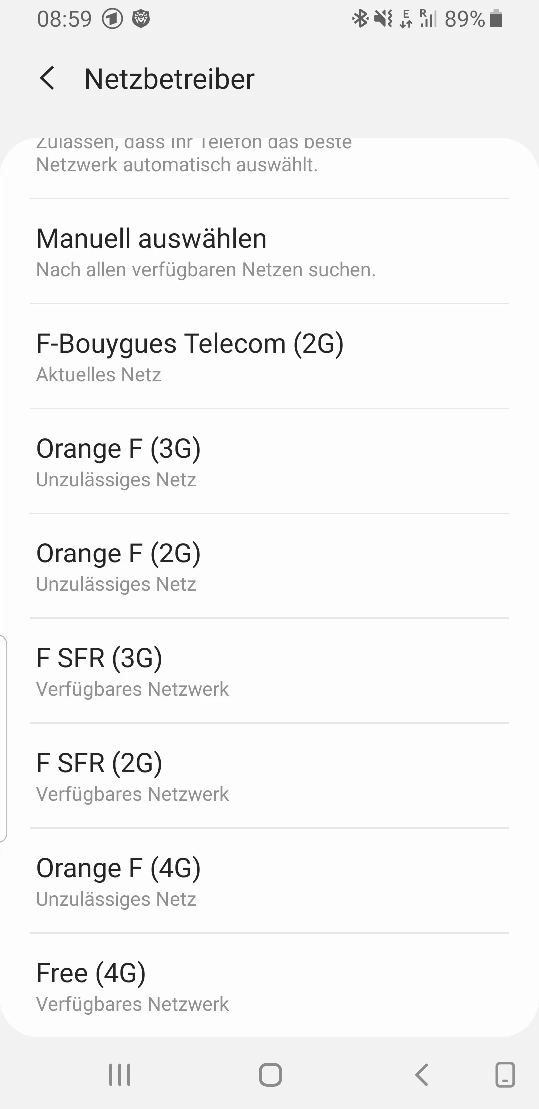 Ohne LTE geht auch nicht, sämtliche Orange (F) Netze werden bei manueller Netzauswahl als unzulässiges Netz angezeigt. Alle anderen Netze als "Verfügbar".