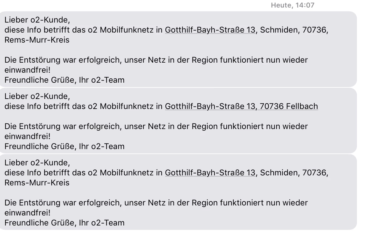 Das Problem besteht seit Dienstag, also nun seit sechs Tagen. Störungsmeldungen habe ich ein paar über die App aufgegeben, ein paar Tage später bekommt man nur entsprechend eine SMS, dass man zu der Störung nichts nachweisbares finden könne, man würde aber intensiver schauen und sich innerhalb von zwei Tagen erneut melden. Diese SMS bekommt man dann auch, aber auch nur mit der Info, dass nichts gefunden werden konnte.