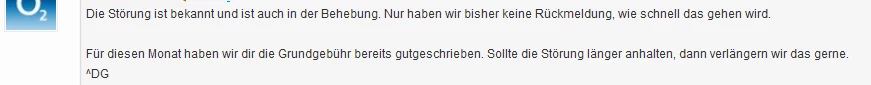 Was genau möchtest du? Eine Gutschrift? Die wird in der Tat erst berechnet, wenn die Störung vorbei ist. Daher melde dich dann erneut bei o2.