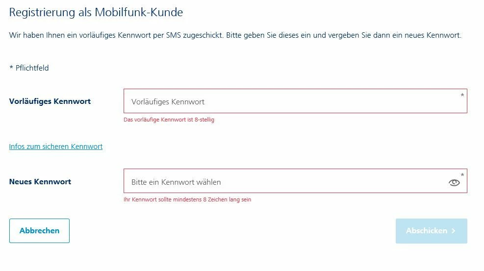 Das vorläufige Kennwort hast du von uns per SMS bekommen. Dieses gibst du ein und kannst dann ein eigenes Kennwort bestimmen, dass du unten eingibst.