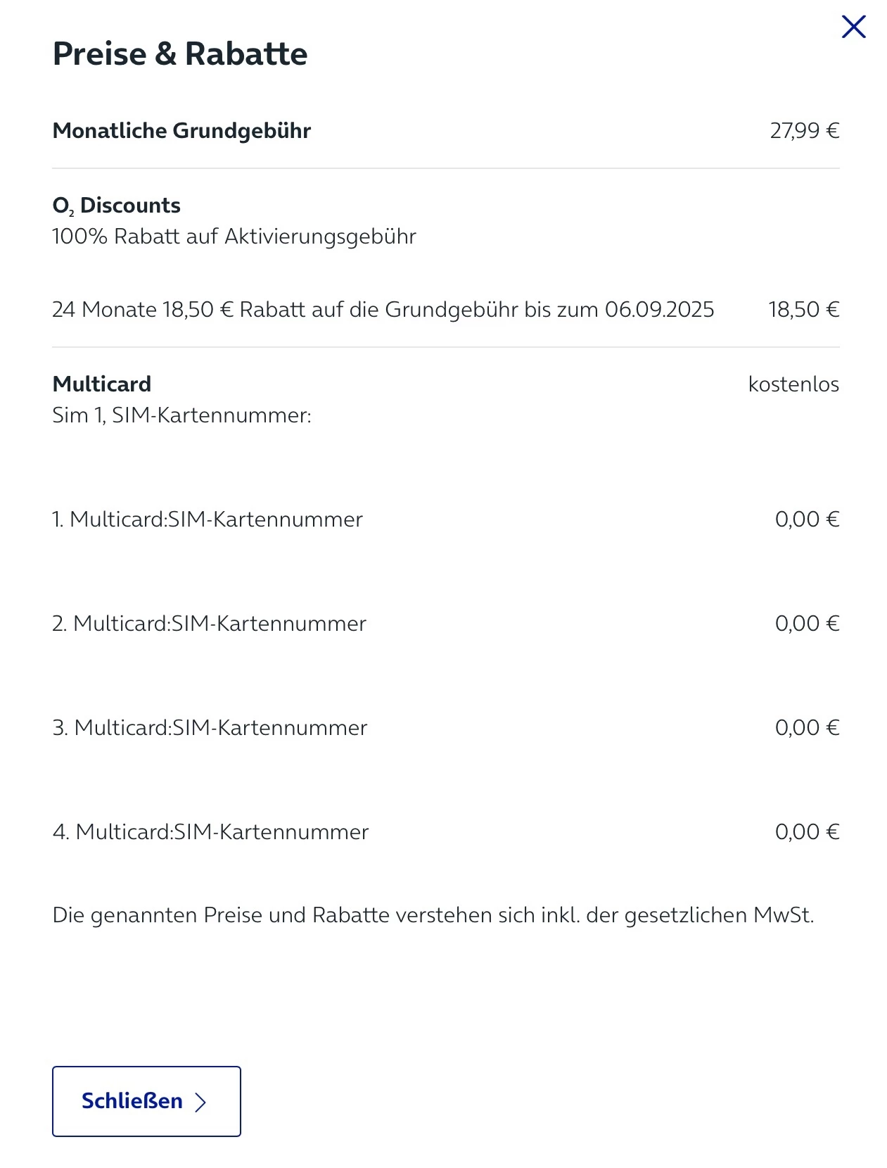 Nun steht der Vertrag in meiner Liste zu 24,99€. Von Rabatt keine Rede. Bei allen anderen Verträgen sehe ich die Rabatte - nur hier nicht. Also wurden die 14€ Kombivorteil sowie 4,50€ Tarifrabatt nicht erfasst. Ich bitte daher um Korrektur.