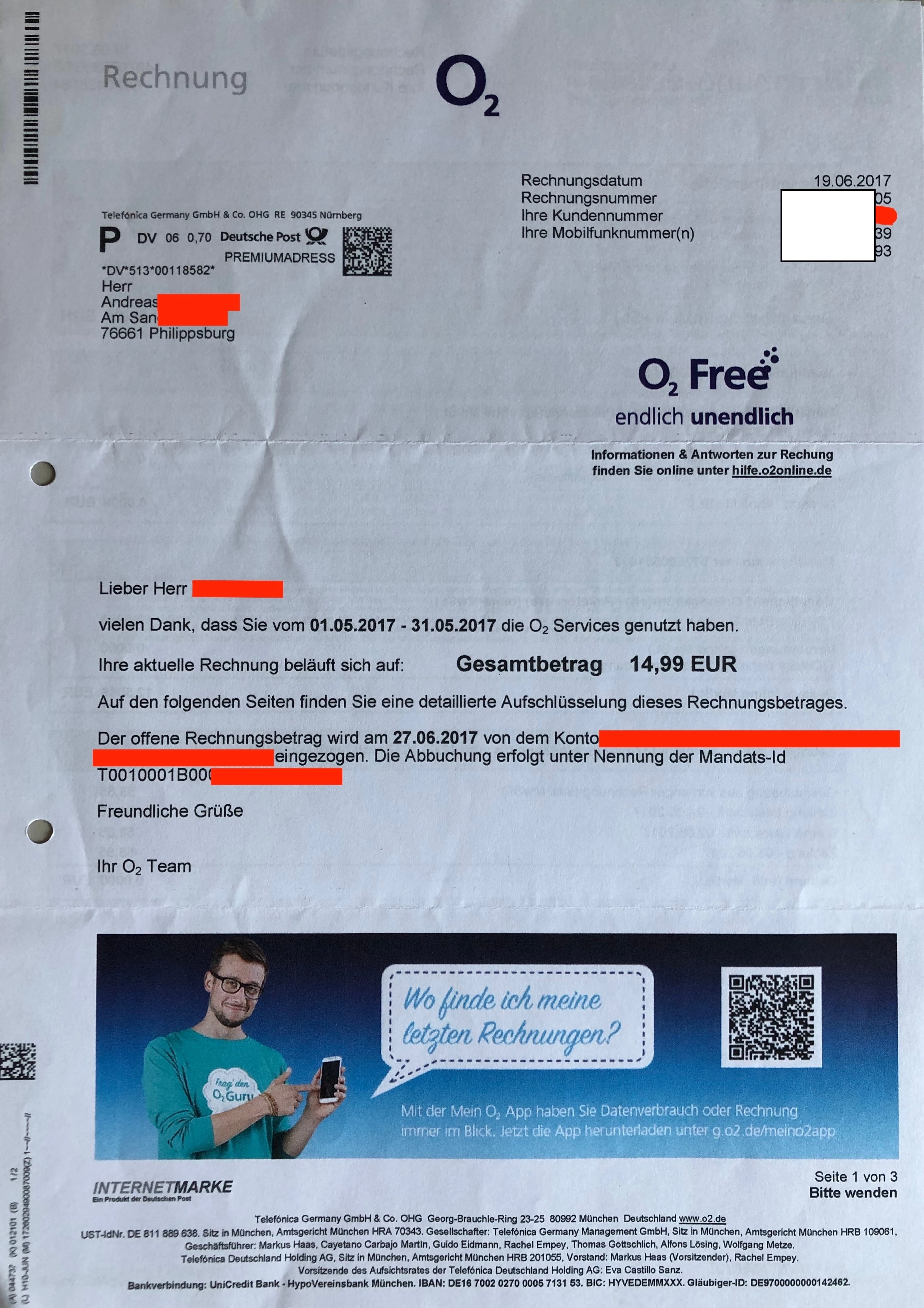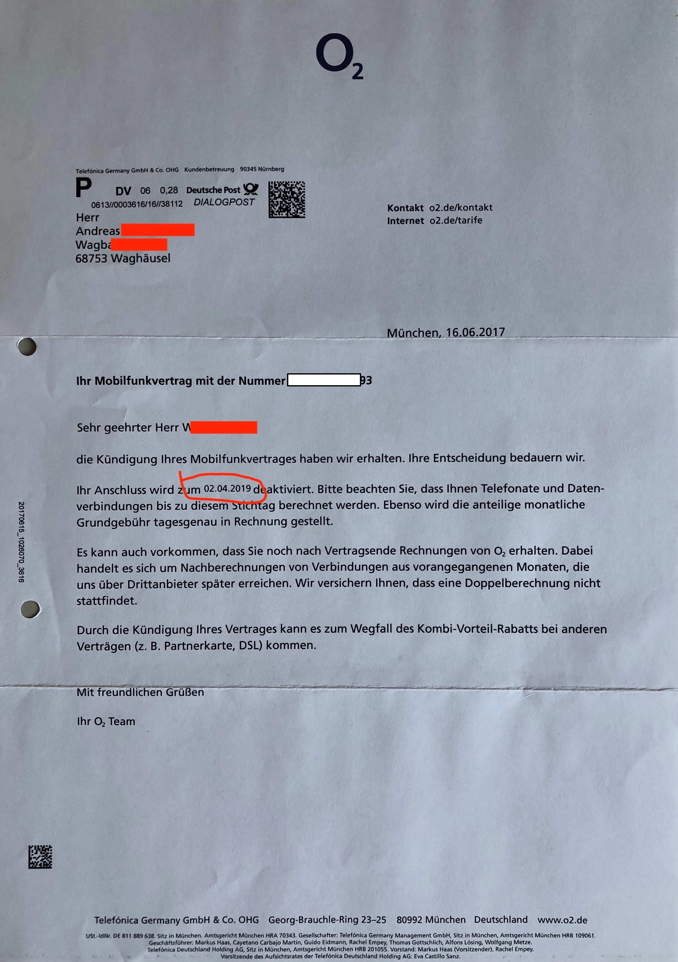 spannenderweise bekam ich heute (wieder) eine Rechnung über einen Mobilfunkvertrag welchen ich so gut wie nie genutzt und gekündigt habe. Gemäss meiner schriftlichen Kündigungsbestätigung von O2 vom 16.6.2017 ("Ihr Anschluss wird zum 2.4.2019 deaktiviert.") hätte ich bereits nicht die weitere Abbuchung vom Konto der 14,99€ im April erwartet, und wollte diesbezüglich ohnedies nochmals nachforschen. Aber nachdem nun wiederholt heute ebendiese 14,99€ einfach weiter abgebucht wurden habe ich euch dieses Mal die Arbeit abgenommen und direkt zurückgebucht. Weil nie genutzt (steckt im iPad was das WLAN fast nie verlässt) handelt es sich dabei auch nicht um "Nachberechnungen aus vorangegenagenen Monaten", sondern wieder mal offensichtlich um irgendein IT-Problem bei Euch.