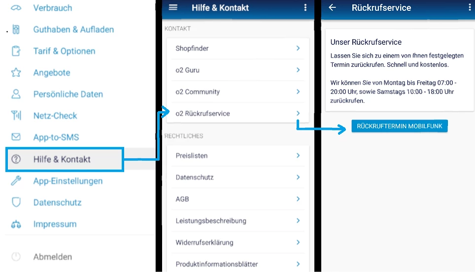 konnten dich unsere Kolleginnen und Kollegen mittlerweile telefonisch erreichen? Wenn nicht, kannst du auch über deine Mein o2 App unter Hilfe und Kontakt -> o2 Rückrufservice deinen persönlichen Rückrufservice aktivieren und dir dafür eine passende Uhrzeit aussuchen.