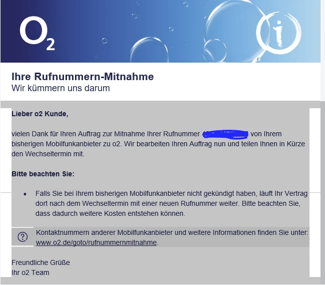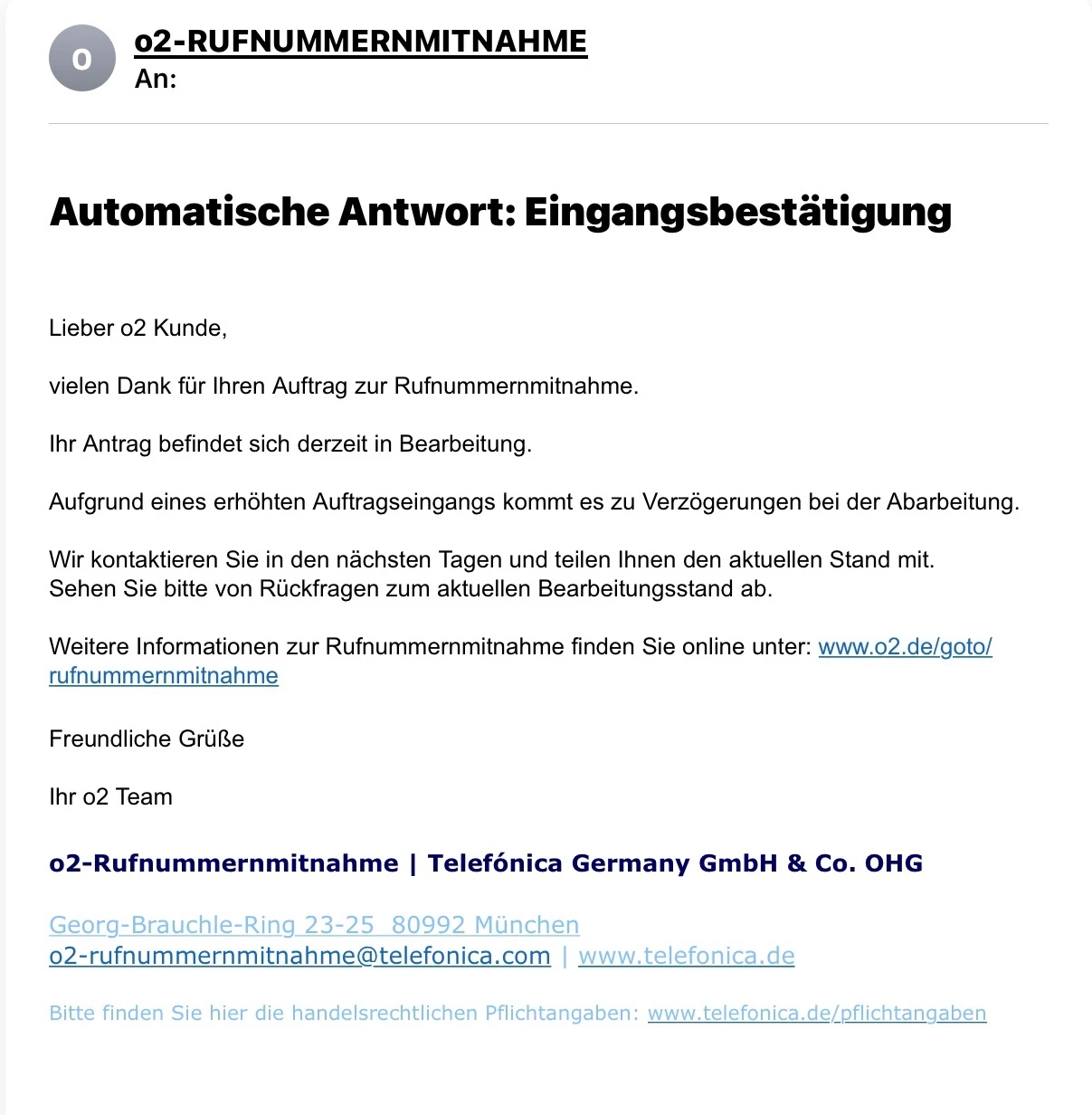 So eine ähnliche automatische Anwort-email erhielt ich die ersten beiden Male unmittelbar auf meine Beauftragung hin. Das letzte Mal jedoch seit 2 Tagen nicht. Nun warte ich mal ab was geschieht. Ich habe zwischenzeitlich gelesen dass die Rufnummerportierung bis zu 90 Tage nach Vertragswechsel noch geht.