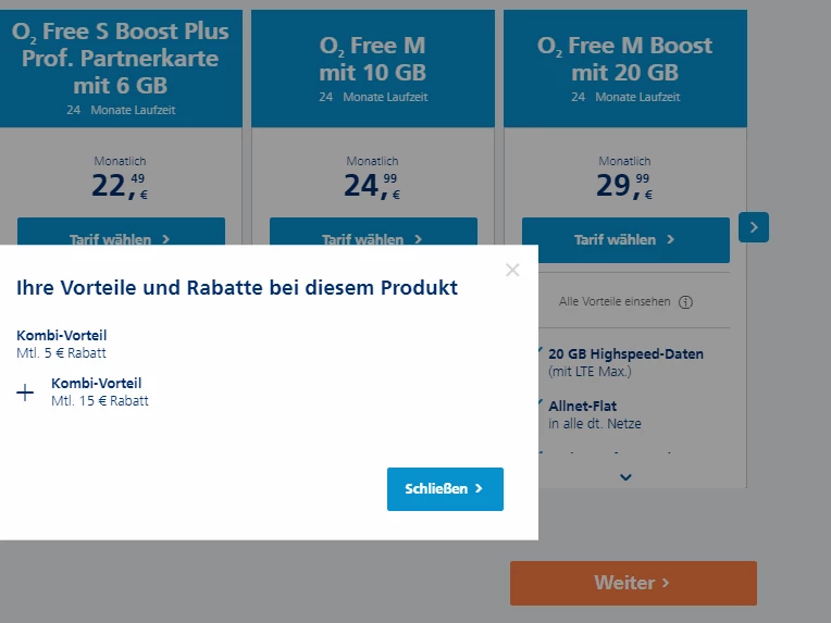 Ich habe gerade mal bei der Verlängerung vom kleinsten Vertrag geschaut, dort stehen 14,99 auf der Angebotsseite, rufe ich die Vorteile auf, stehen dort auch 5 Kombi und 15 Rabatt.