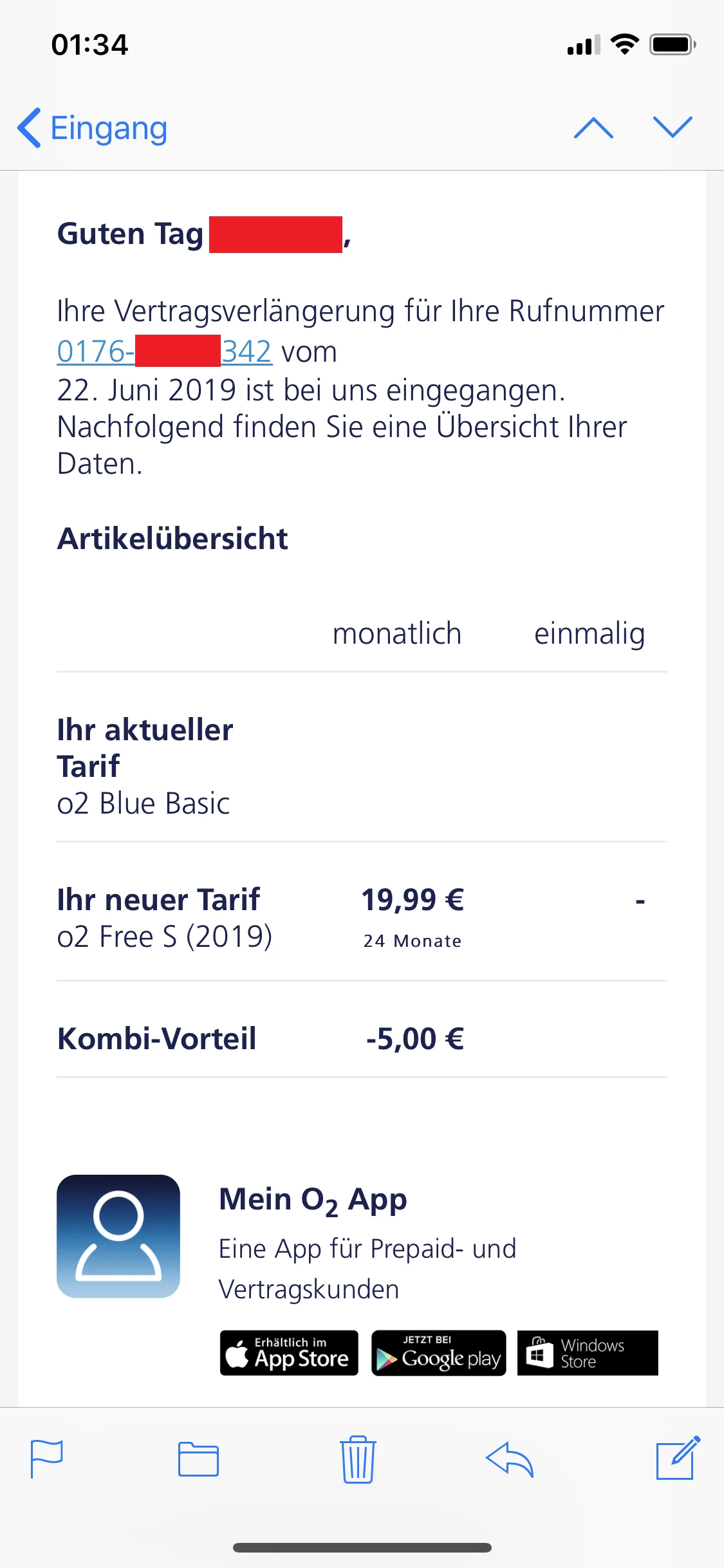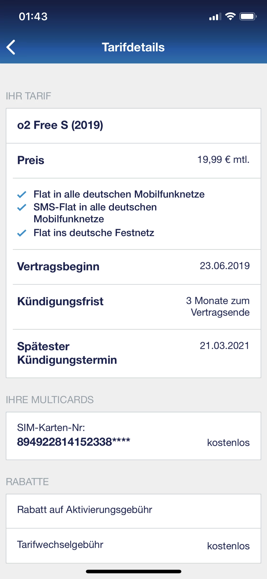ich habe eine kurze Frage zu dem gerade von mir durchgeführten Tarifwechsel von Blue Basis zu Free S für die Rufnummer 0176-xxxxx342. In O2 App unter Tarif und Optionen ist jedoch der versprochene monatliche Nachlass, sprich Kombi-Vorteil, , da ich gleichzeitig 2 Verträge abgeschossen habe, in Höhe von 5€ nicht zu sehen.(s. Anlage). Ist da ein Fehler unterlaufen? Wird diese Vergünstigung nachher in der Rechnung berücksichtigt?