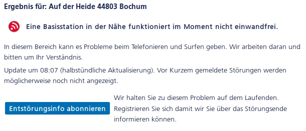 laut Livecheck gibt es gerade eine Netzstörung an der Station "Auf der Heide, 44803 Bochum".