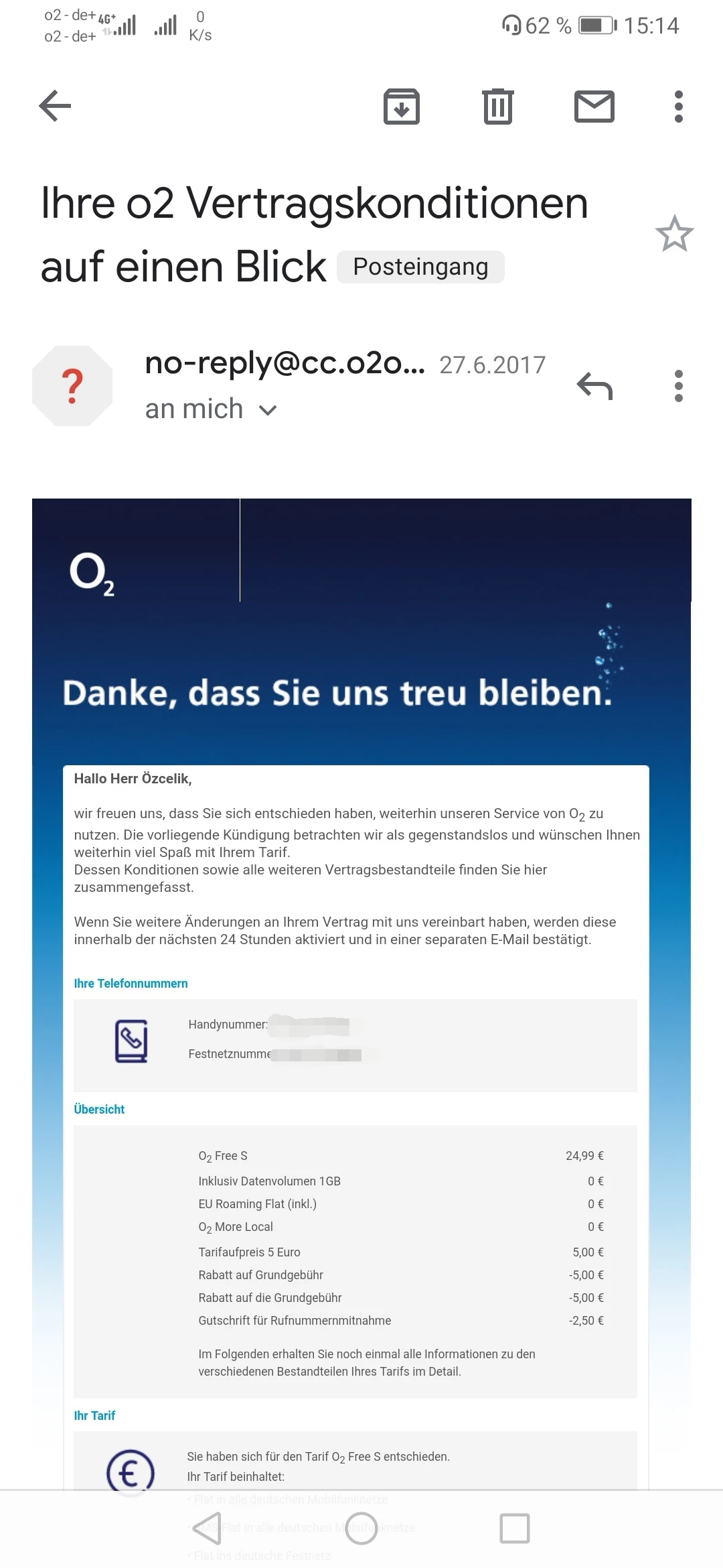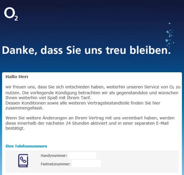 Dieser Email war eine tarifbenachrichtigungsmail über meine Rabatte und Zahlungen was ich schon oft bekommen hatte.Nein. Diese Mail ist anders. Da steht doch eindeutig, dass Du (aus Sicht von o2) die Kündigung zurückgenommen hast.