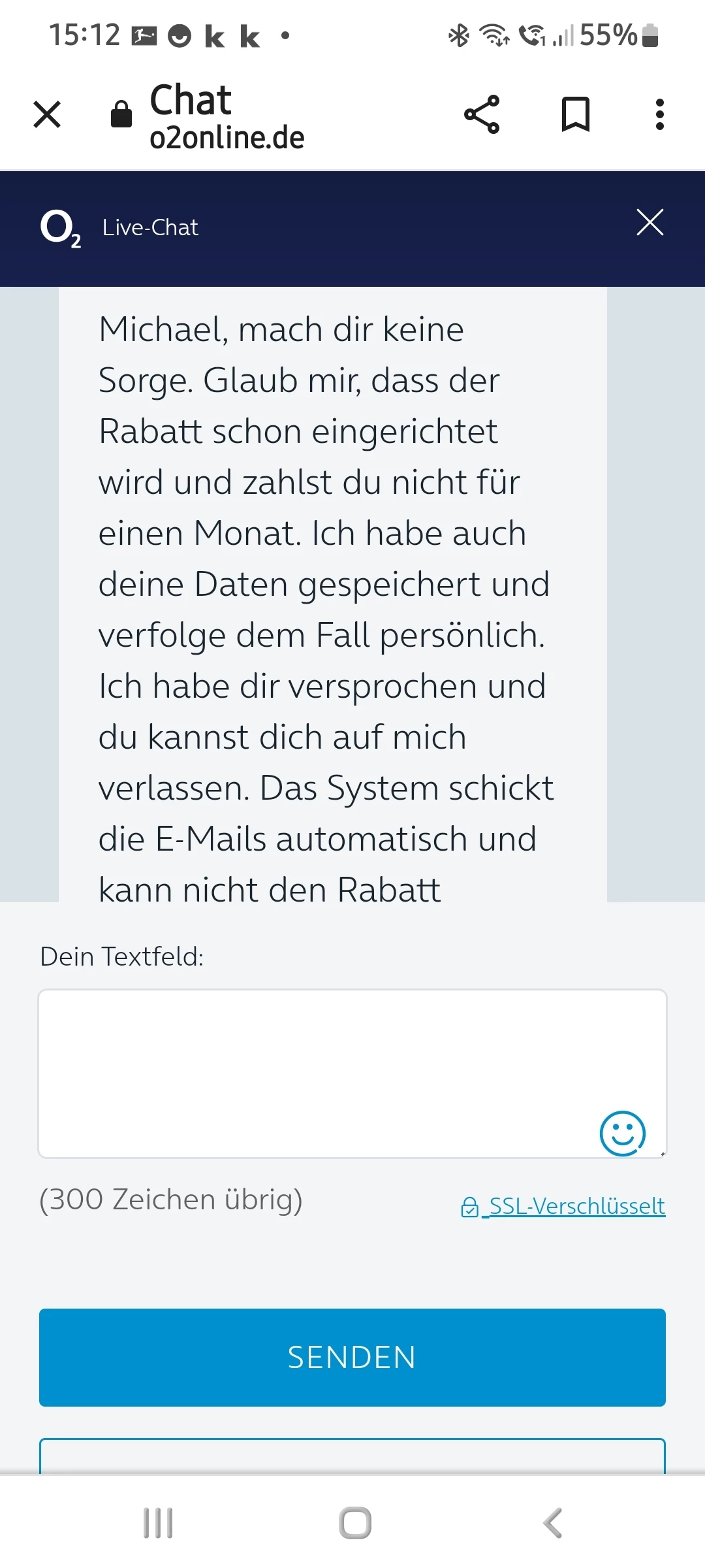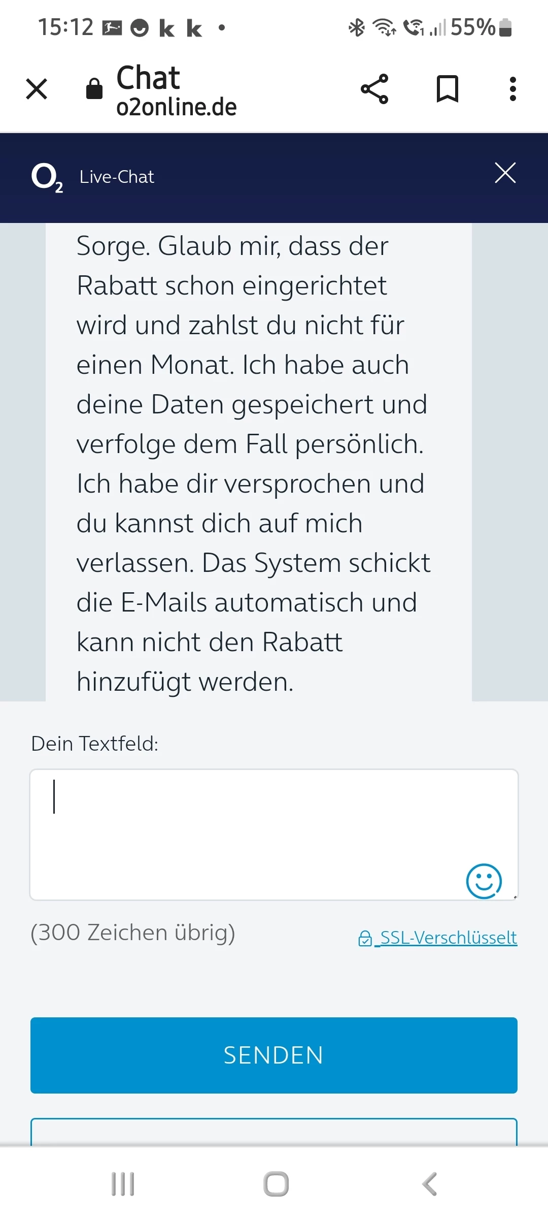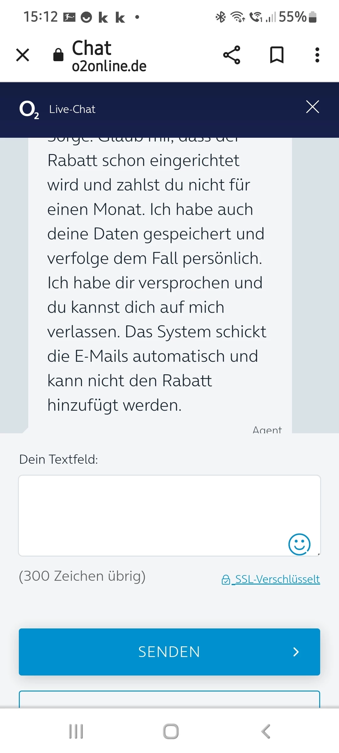 Das ist doch das Problem ... Ihr Kollege schreibt im Chat, dass der Rabatt für den ersten Monat in der Vertragszusammenfassung nicht ausgewiesen werden kann.  Er verspricht aber, dass der Rabatt hinterlegt ist und er sich persönlich darum kümmert. Die Emails werden vom System automatisch rausgeschickt. Lesen Sie sich die Screenshots durch - genauso hat Ihr Kollege mir den Rabatt zugesagt.