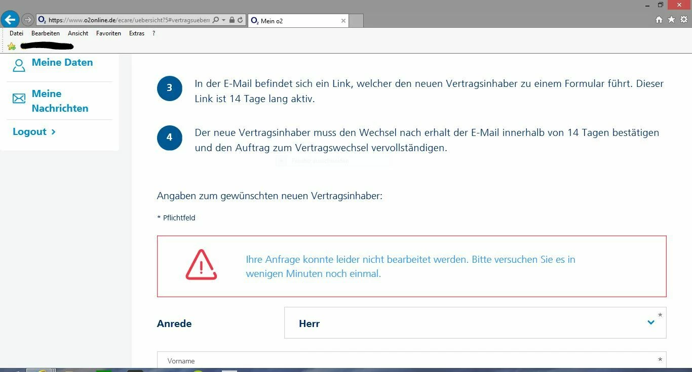 Also cookies sind zugelassen habe es jetzt probiert im geschäft (o2) zu machen dann von meinem Handy aus und auch zu Hause am Computer. Leider bei allen das gleiche und zwar fülle ich wie gehabt die 3 Felder aus setze den Haken fürs akzeptieren und gelesen und dann abschicken was aber nicht funktioniert. Eine Fehlermeldung bekomme ich nicht