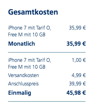 Unseren o2 Free M Tarif (10GB) mit dem I Phone 7 32GB für zusammen 43,49 € monatlich. Die Summe setzt sich aus 25,49 € für den Tarif und 18,00 € für das Handy zusammen.