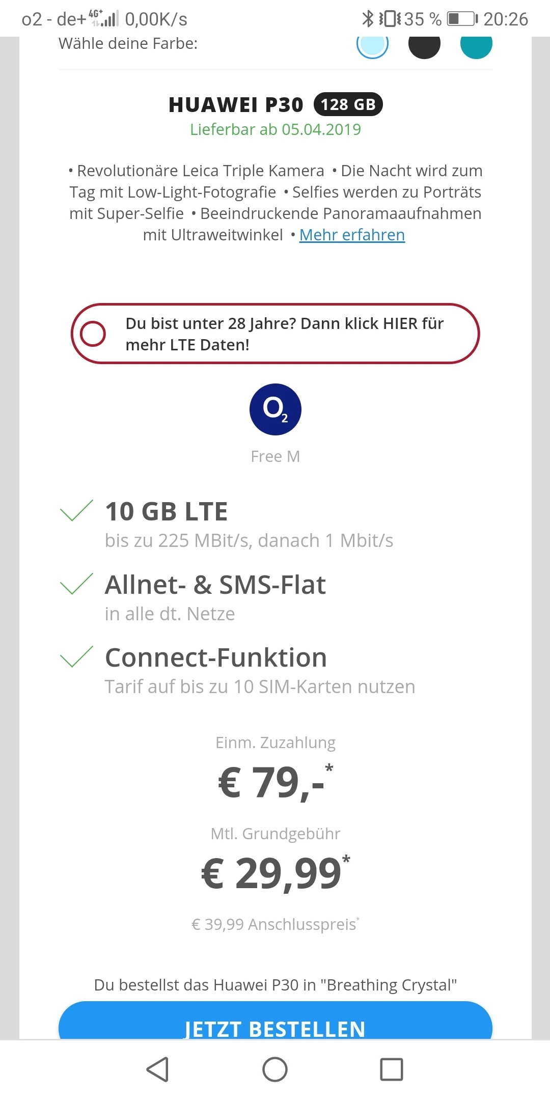 Dazu wolltest du das Huawei P30. Hier kostet die monatliche Rate 21,50 EUR. Hinzu kommen eine einmalige Anzahlung von 129 EUR und 4,99 EUR Versandkosten. Du hast Glück, denn für unsere Bestandskunden können wir das Handy momentan 100 EUR günstiger anbieten.