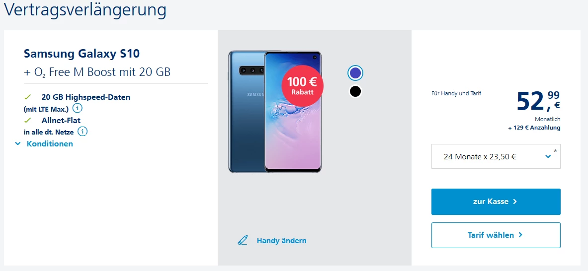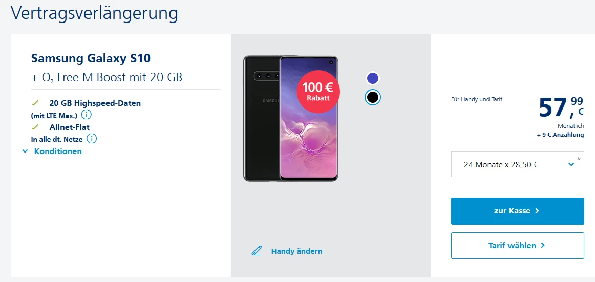 Dazu wolltest du das Samsung Galaxy S10. Hier kostet die monatliche Rate 28,50 EUR. Hinzu kommen eine einmalige Anzahlung von 9 EUR und 4,99 EUR Versandkosten.