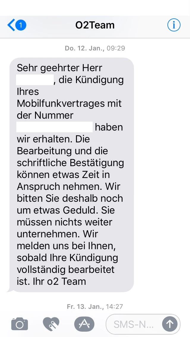 Hier die SMS die ich im Januar bekommen habe, welche keine Kündigungsbestätigung darstellt - eher eine Kenntnisnahme.