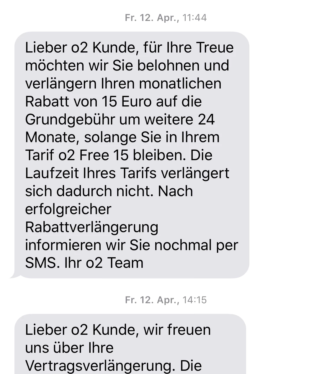 Zu den SMS: in Deinem Screenshot sieht man doch, dass die Verlängerungs-SMS zeitlich NACH der Info-SMS kam, in der Dir mitgeteilt wurde, dass der Rabatt (nur) bestehen bleibt, solange Du den (alten) Tarif unangetastet lässt, unterstrichen durch den Zusatz, dass die (alte) Vertragslaufzeit nicht berührt wird. Durch Deine aktive Verlängerung hast Du faktisch einen neuen Vertrag abgeschlossen mit einer entsprechend neuen Laufzeit (24 Monate).