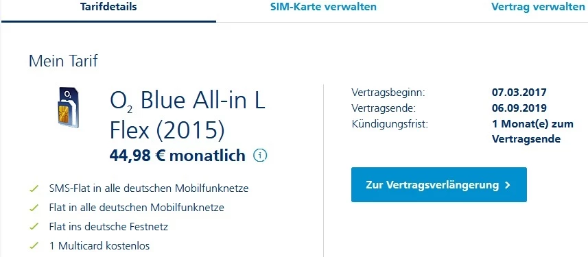 Okay, vielen Dank. Aber nur um noch mal auf Nummer Sicher zu gehen, da steht "Vertragsbeginn: 07.03.2017", Vertragsende: 06.09.2019", "Kündigunsfrist: 1 Monat(e) zum Vertragsende" und der Vertrag ist O2 Blue All-in L Flex (2015) mit diversen Rabatten, damals abgeschlossen als Chip Handytarif über Tarifhaus. Es kann nicht sein das dieser Vertrag jetzt einfach so ohne Mitteilung gekündigt wird und ich ab September dann den vollen Preis ohne die Rabatte zahlen muss?