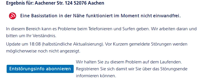 Soweit ich das richtig sehe, sollte es die Station "Aachener Str. 124 52076 Aachen" betreffen. Ist diese Station in deiner Nähe? Denn genau diese Station hat neue Einträge in der EMF3 Datenbank der BNetza, deshalb könnte die Störung auch bedingt durch den LTE Ausbau sein.