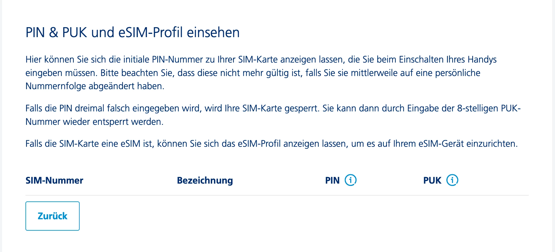 Brauche Hilfe, da ich nicht an meine PUK komme. Unter "PIN & PUK und eSIM-Profil einsehen" wird mir nichts angezeigt (siehe Screenshot). Anrufen kann ich nicht, da meine SIM-Karte gesperrt ist. Vielen Dank und viele Grüße, Konstantin