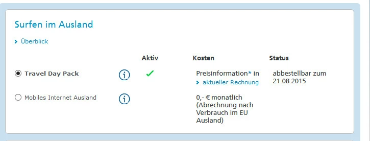 Sobald du die neue Option ausgewählt hast, steht hinter dem "Travel Day Pack" beim Status nicht mehr "Abbestellbar zum 21.08.2015" sondern "Abbestellt zum 21.08.2015".
