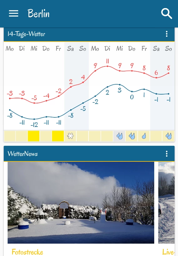 Auch mit der Wetter Online-App lässt sich die aktuelle Wetterlage für den eingenen Standort und beliebige weitere Städte jederzeit abrufen. Es gibt einen Wettertrend mit einer 14-Tage-Vorhersage, die über die Temperaturen, die Regenwahrscheinlichkeit, Luftdruck und -feuchtigkeit sowie Sonnenauf- und -untergang informiert.