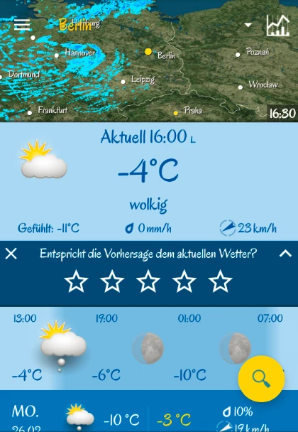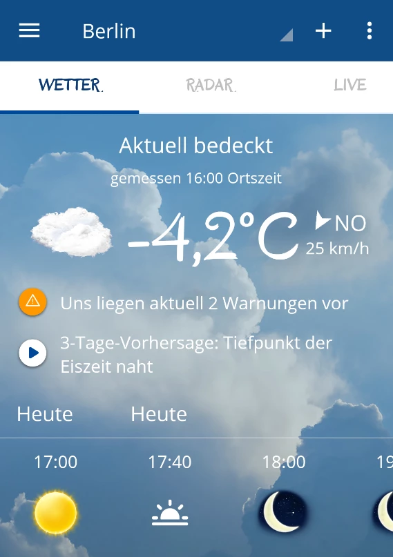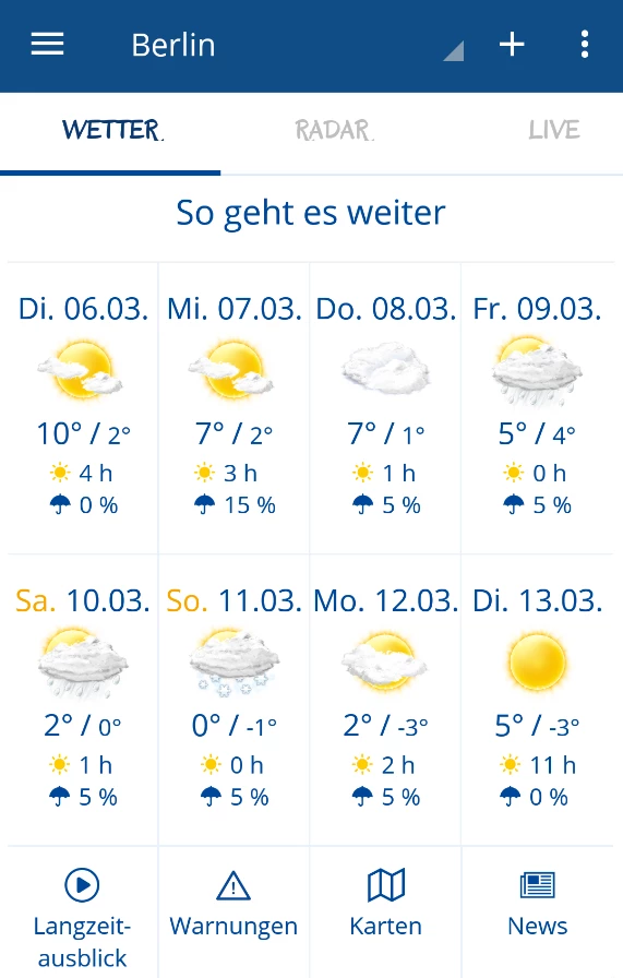 Mit der wetter.com-App kann die aktuelle Wetterlage am eigenen Standort und an jedem anderen Ort gecheckt werden. Sie hat eine 7- und 16-Tage-Vorschau, was die Planung von Aktivitäten unter freiem Himmel erleichert.
