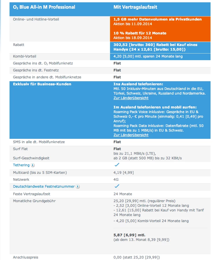 Auch wenn "Mein O2" nicht alle Details vom o2 Blue All-In M Professional darstellt (was ohnehin nicht besonders hilfreich bei der Ermittlung der eigenen Daten ist), lässt sich die Angelegenheit wahrscheinlich erst mit einem Tarifvergleich erklären: