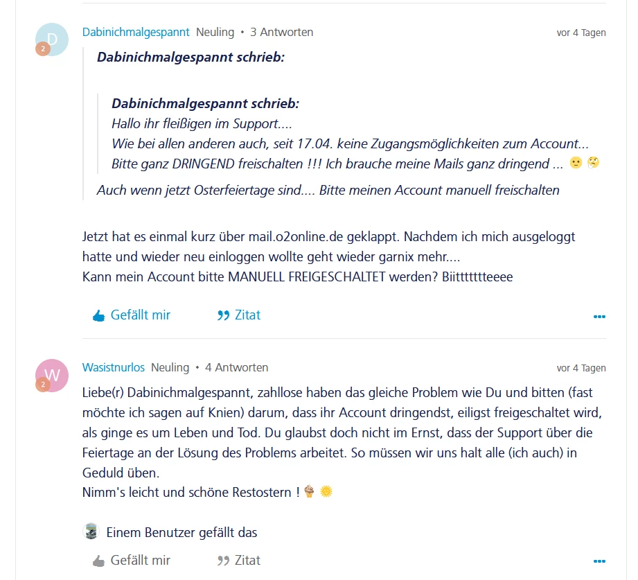 Mein Problem besteht immer noch darin, dass ich mich zwar im WebMail anmelden und auch lesen und schreiben kann. Aber mein Mail Client Windows Live Mail funktioniert seit 17.4. überhaupt nicht mehr, der Server akzeptiert meine Anmeldung nicht. Siehe auch mein Post an O2Emanuel.