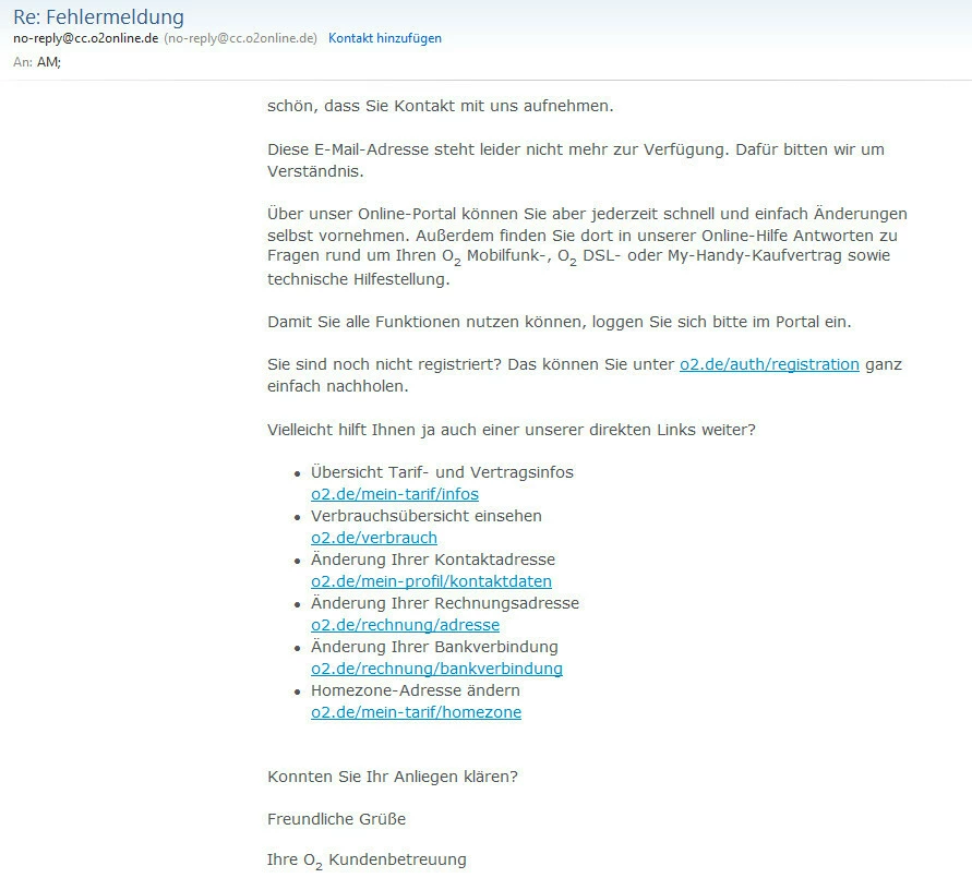 Ich kann emails schreiben, die auch ohne Probleme gesendet werden. Aber ich kann nicht sagen, bei welcher gesendeten email diese Anwort von o2 kommt.
