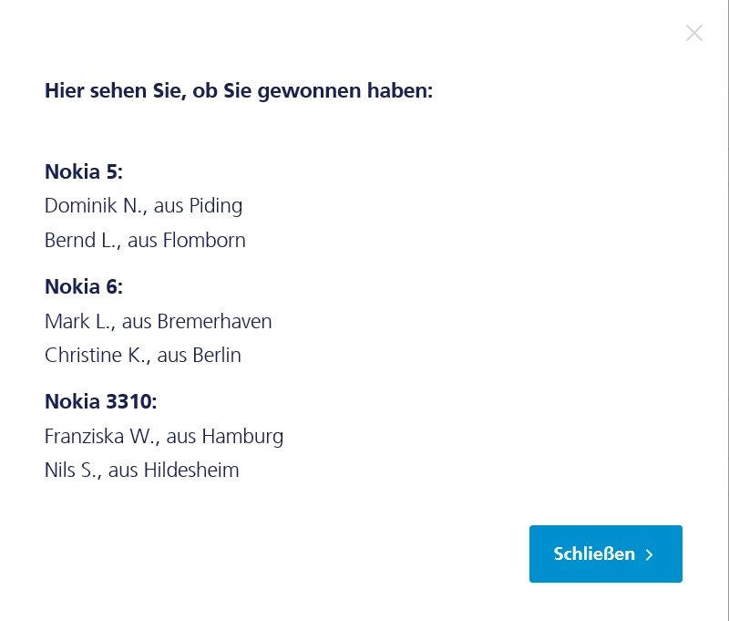 Hallo. Ich hatte letzten Monat bei dem Gewinnspiel wegen den Nokia Handys mitgemacht aber leider ist das komplett verschwunden. Ich hab schon in den abgelaufenen Gewinnspielen geschaut, weg. Kann mir mal bitte irgendwie nen Link schicken damit ich weiß ob ich mal gewonnen hab? Denn ich mach jedesmal mit aber gewinnen tue ich nie