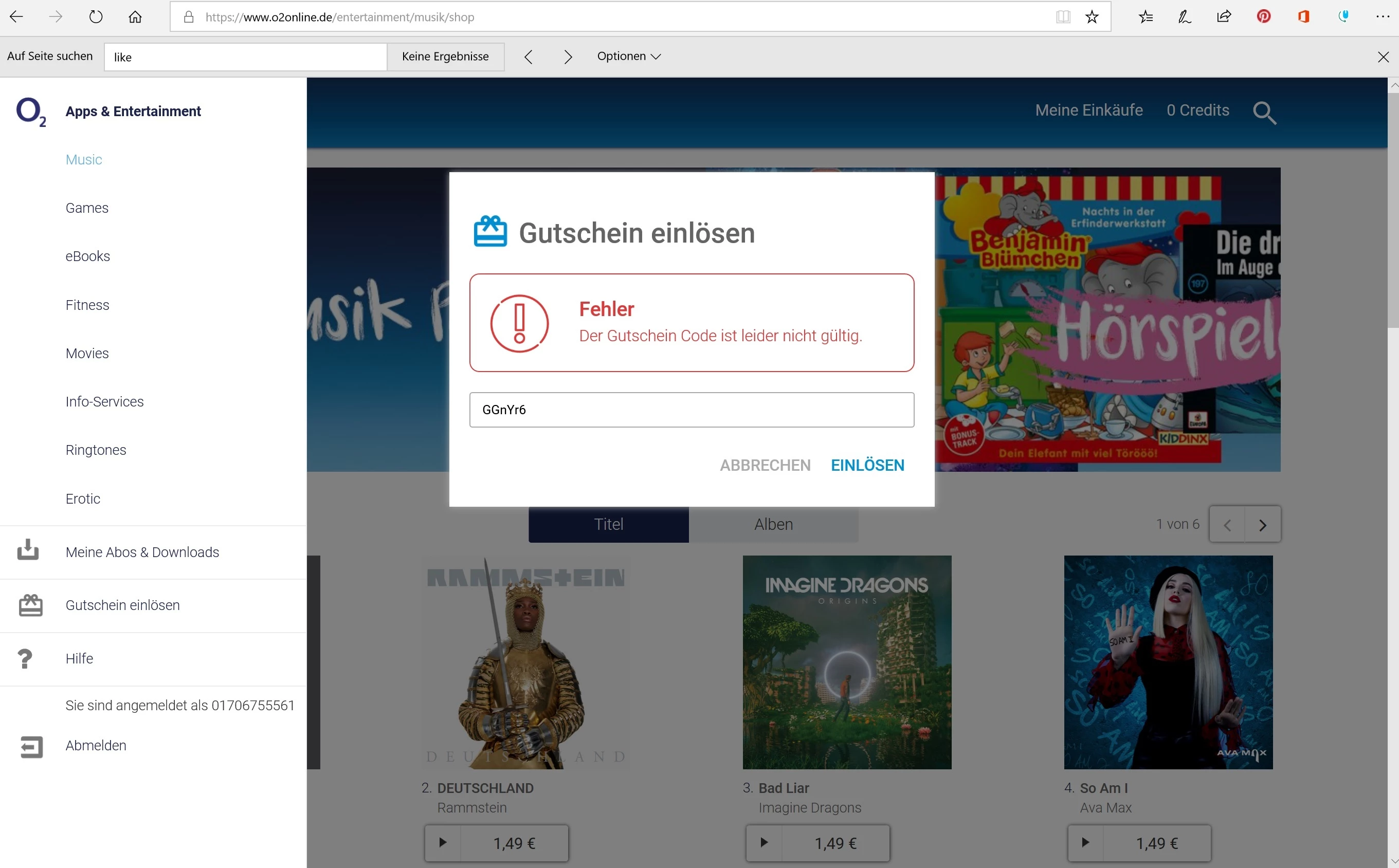 Wieso der Code nicht funktioniert - obwohl ich ihn ja gerade erst über "Mehr-O2" erhalten habe!
