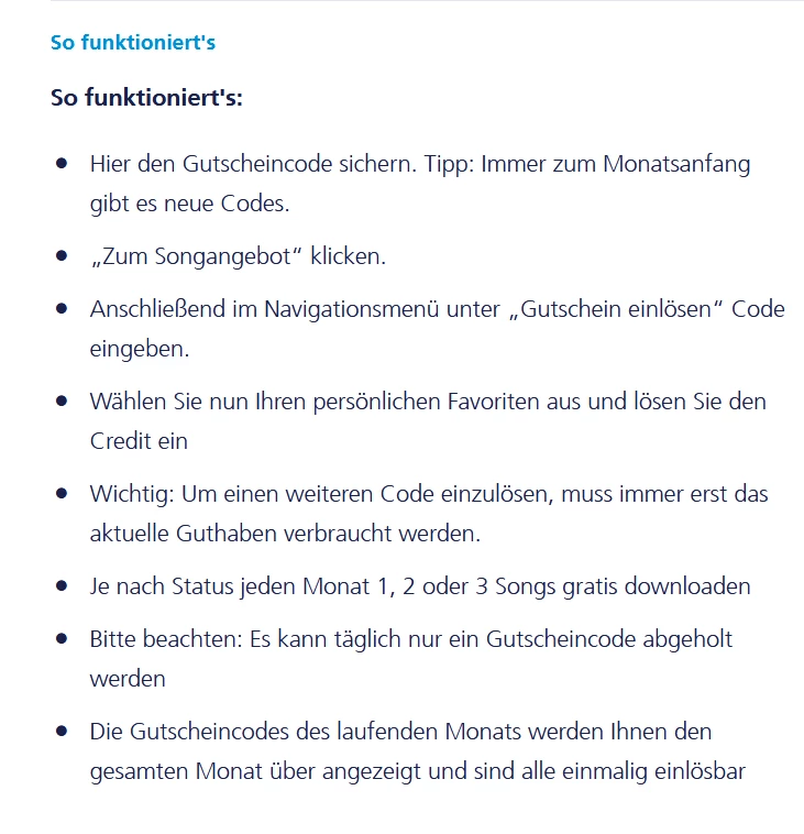 ich wollte das auch mit dem Gratis-Song machen, jedoch hat es dieses Mal nicht geklappt (sonst konnte ich den Code vor Abschluss eintragen, jetzt kommt nach "Jetzt kaufen" nichts mehr und den Code kann ich nicht einlösen. Im Nachhinein habe ich gesehen, dass man jetzt erst den Code eingeben muss. Jetzt habe ich ein Credit, aber der Song wurde mir berechnet. Kann man das miteinander verrechnen? Und wie komme ich im Silberstatus zu 2xSongs, weil der Code ist ja nur einmal gültig, oder mache ich etwas falsch?