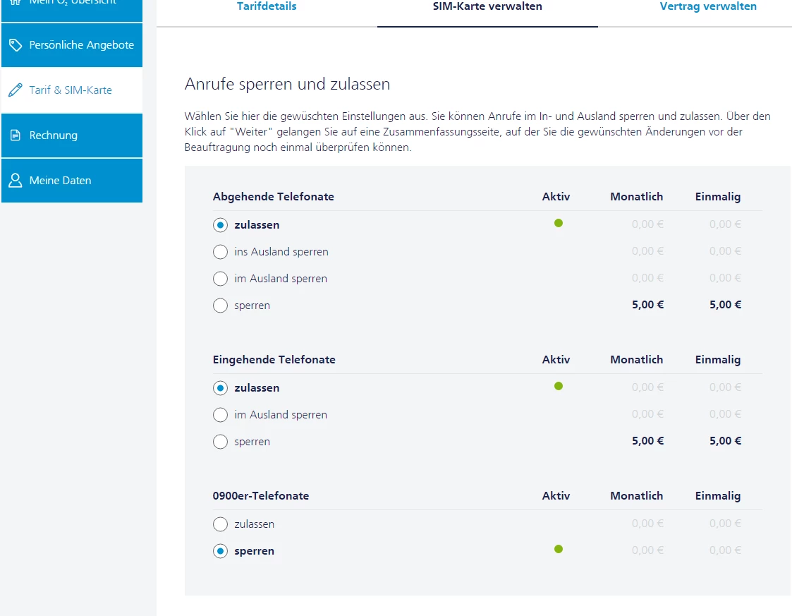 Hast du einmal unter "Mein o2" geschaut, ob diese gesperrt sind?