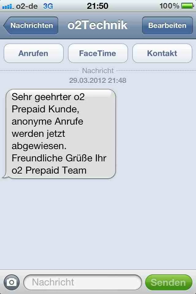 können Besitzer eines O2-Mobilfunkvertrags kostenlos den sogenannten “Anonymous Call Rejection”-Service (ACR) beantragen. Alle anonymen Telefonanrufe, bei denen die Rufnummer unterdrückt wird, kommen nicht mehr durch. Der anonyme Anrufer erhält von O2 einen entsprechenden Hinweis. Der Anrufblocker ACR lässt sich über die Kundenhotline kostenlos aktivieren.