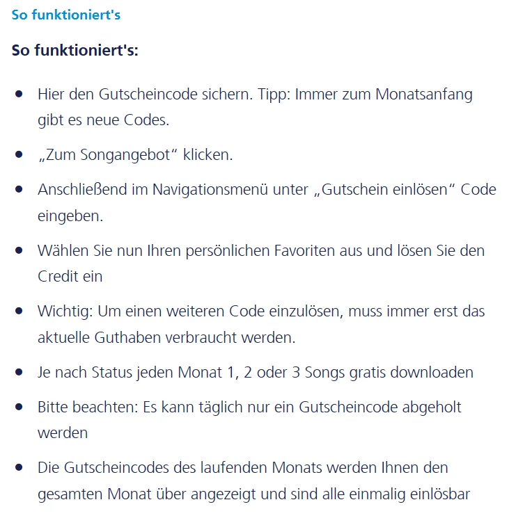 Die Website wurde angepasst und nirgends konnte man den Code für meine 3 Gratis-Downloads eingeben (letzten Monat war das ohne Weiteres möglich). Jetzt habe ich, glaube ich, Madcon-Got a little drunk für 1.49 € gekauft. Ich bitte um Erstattung (Codes siehe unten) und bitte auch Erläuterung, wie ich zukünftig meine Codes einlösen kann. Vielen Dank.