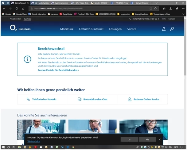 Hallo, nach erfolgreichem Login komme ich unter Mein O2 nicht mehr auf meine Daten. Er will immer in den Businessbereich wechseln, obwohl ich Privatkunde bin und mich auch als Privatkunde eingeloggt habe (grünes Häckchen unter Mein O2). Gestern wurde nach Umzug mein O2 DSL wieder freigeschaltet und geht auch. Technicker wollte aber nicht die neue HomeBox installieren, sondern die alte. Jetzt wollten wir gucken, welche HomeBox wir zurückschicken müssen, die alte oder die neue. Der Techniker hat gesagt, das wäre egal, was ich aber nicht glaube. Kann uns jemand weiterhelfen, habe schon 3 PC's bzw. Laptos ausprobiert, bei allen das gleiche (siehe Bild).
