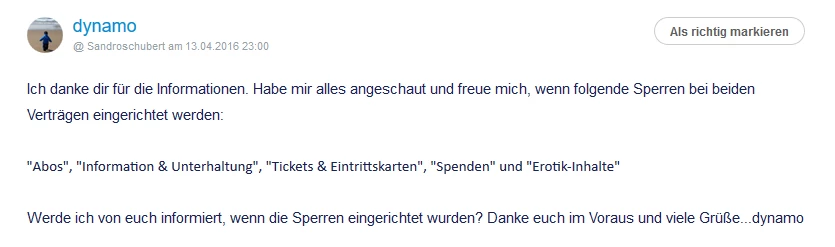 Ich danke dir für die Informationen. Habe mir alles angeschaut und freue mich, wenn folgende Sperren bei beiden Verträgen eingerichtet werden: