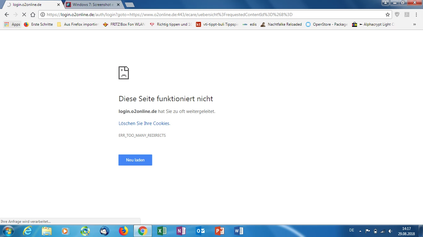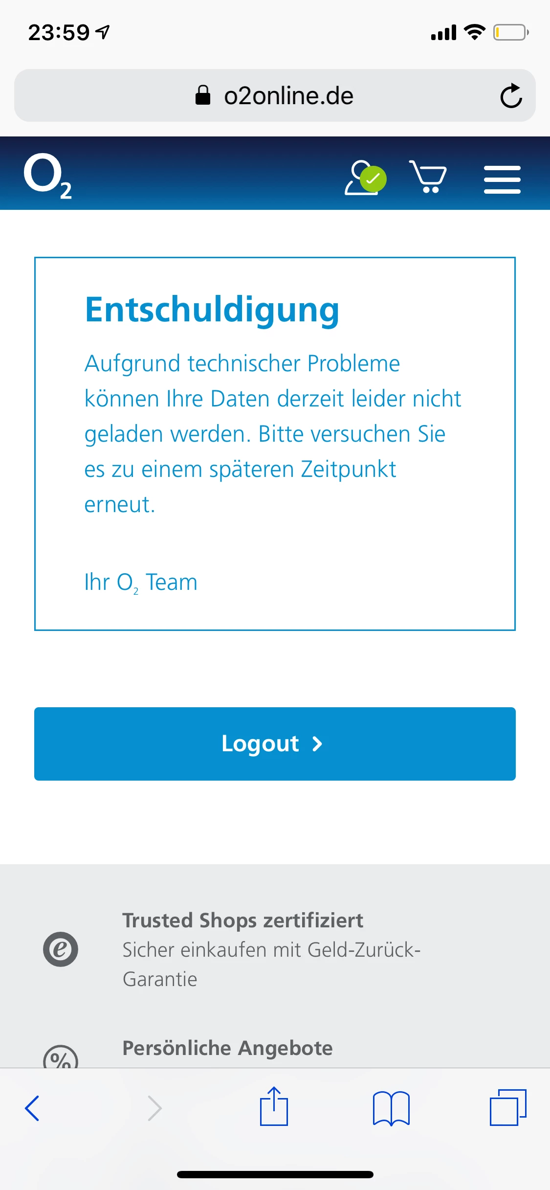 Hallo,kann mich zwar einloggen,aber ansonsten komme ich nirgend wohin bei mein O2.Da steht schon seit Monaten Aufgrund technischer Probleme können Ihre Daten derzeit leider nicht geladen werden. Bitte versuchen Sie es zu einem späteren Zeitpunkt erneut.