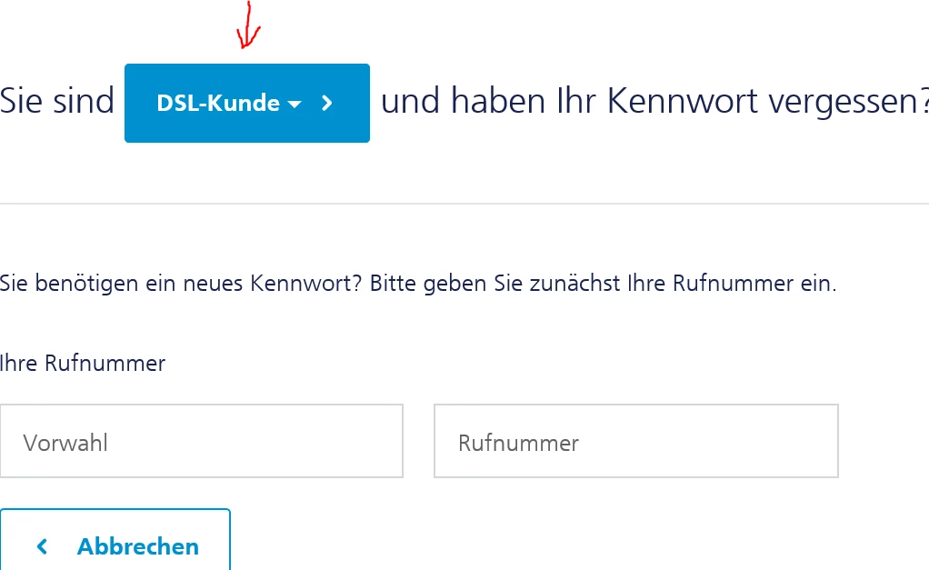 Wenn du ein neues Kennwort benötigst, gehst du einfach beim login auf "Kennwort vergessen" und wählst dann oben aus DSL-Kunde.
