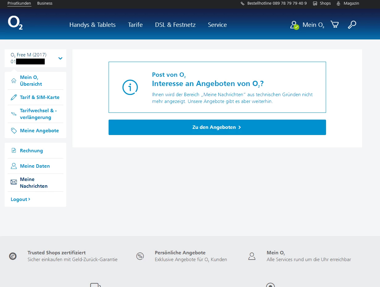 ich habe schon seit längerem das Problem, dass ich meine Nachrichten im meinem O2 Bereich nicht lesen kann. Dort steht, dass meine Nachrichten aus technischen Gründen nicht angezeigt werden können. Ich hatte schon angerufen gehabt und man hat mir gesagt, dass es repariert wird ist aber noch nicht geschehen.