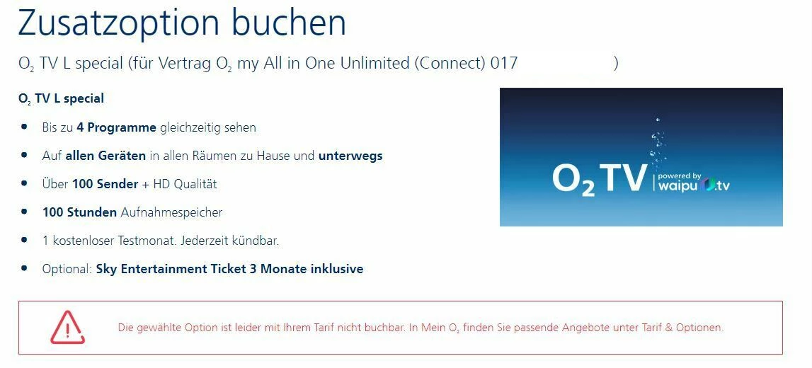angeblich ist o2 TV L nicht für meinen Tarif verfügbar obwohl dieser die der Tarifbeschreibung eindeutig drin steht. der Kundenservice hat dieses auch bestätigt.