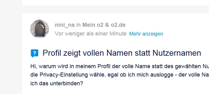 Hi, warum wird in meinem Profil der volle Name statt des gewählten Nutzernamens angezeigt?  Egal wie ich die Privacy-Einstellung wähle, egal ob ich mich auslogge - der volle Name erscheint immer noch.  Wie kann ich das unterbinden?