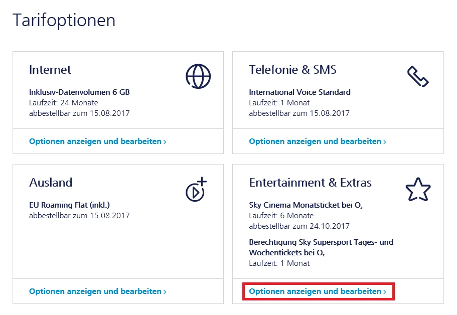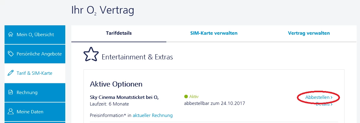 Um dein Sky-Ticket zu kündigen, kannst du ganz einfach im Online-Portal unter "Mein o2" bei "Tarif & SIM-Karte" die "Tarifoptionen" aufrufen und dort unter "Entertainment & Extras" die Optionen bearbeiten: