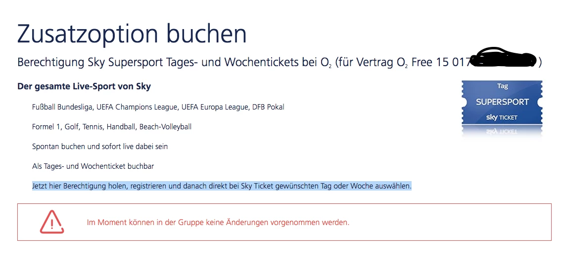 ich versuche seit geraumer Zeit ein Sky Supersport Tagesticket über https:///external-link.jspa?url=https%3A%2F%2Fwww.o2online.de%2Fvorteile%2Fsky%2F zu buchen, erhalte allerdings immer den Hinweis "  Im Moment können in der Gruppe keine Änderungen vorgenommen werden." und kann keine Buchung vornehmen. Registriert bin ich angeblich schon, habe allerdings nie einen Berechtigungscode per SMS bzw. Mail geschwiege denn Zugangsdaten für Sky erhalten. Wie komme ich jetzt an den Code bzw. ein Tagesticket?
