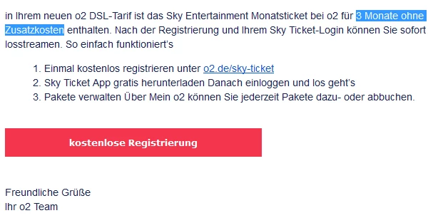 nachdem ich meinen DSL-Vertrag mit O2 abgeschlossen hatte, habe ich eine Email bekommen in der mir mitgeteilt wurde, ich könne zu meinem Tarif das Sky Entertainment Monatsticket für 3 Monate kostenlos buchen. Das ist jetzt schon ein paar Wochen her. Aber nachdem ich heute den Link in der Email benutzt habe komme ich nur zur mein O2 Seite, auf der ich eine Option buchen kann in der der erste Monat schon 4,99 kostet...