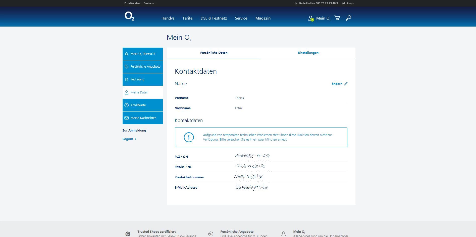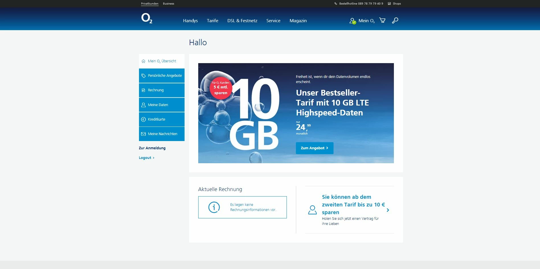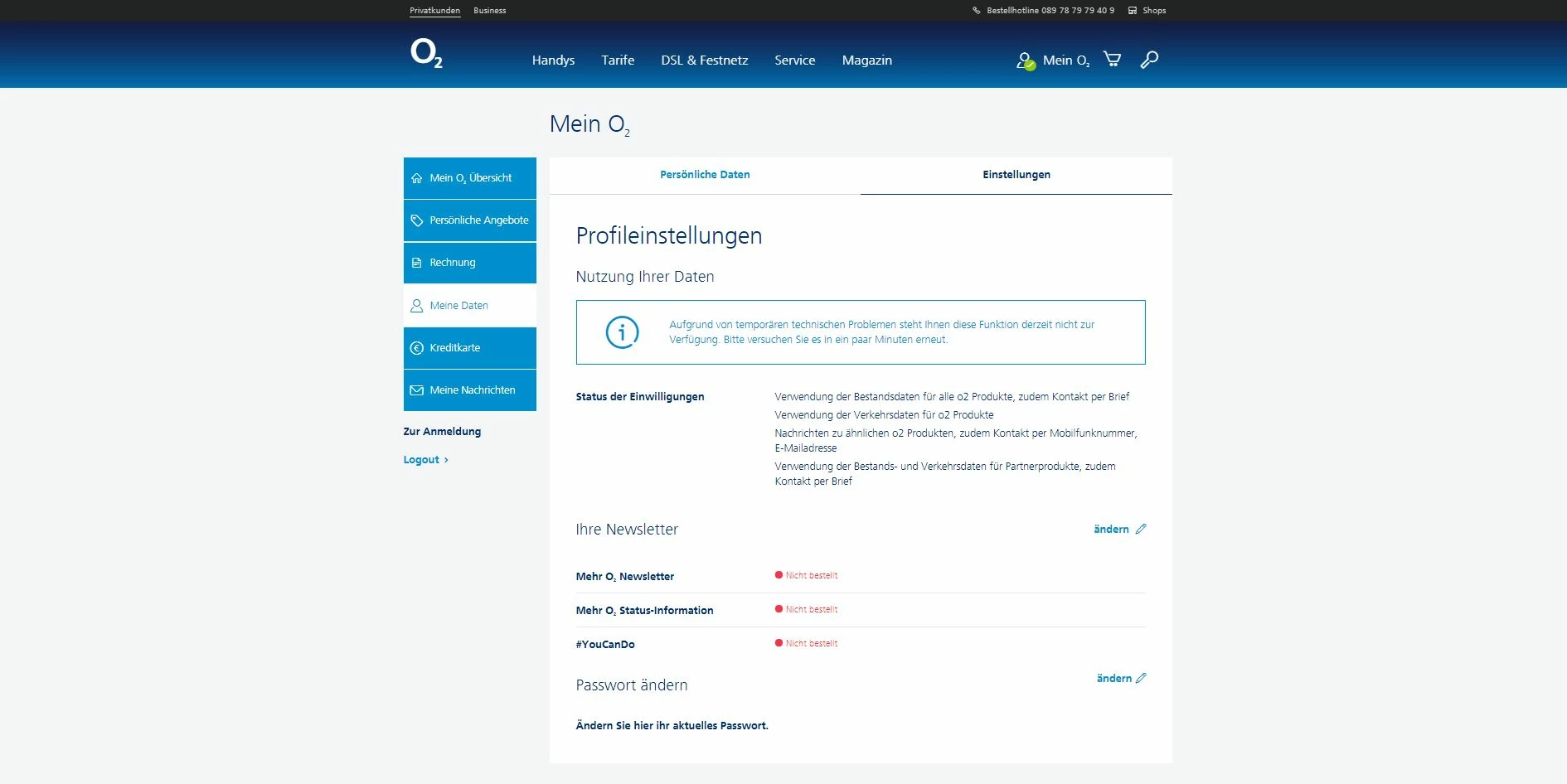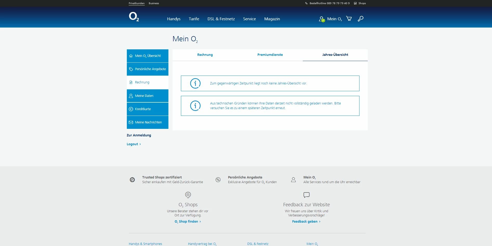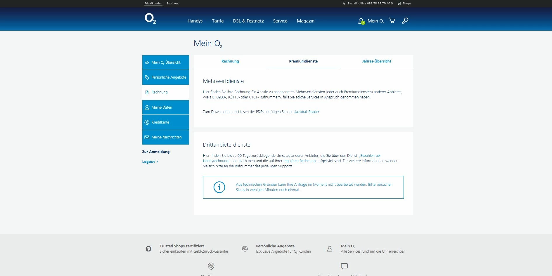 Wenn ich mich bei "mein o2" einlogge, finde ich fast überall den Hinweis zu technischen Schwierigkeiten (Übersicht, Rechnung, Meine Daten...).