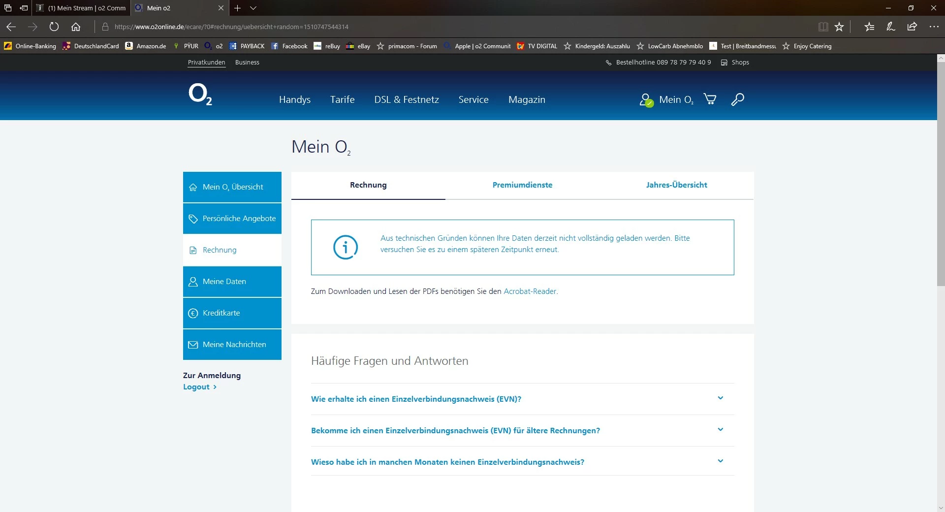 ich habe ein Problem mit meinen mein O2-Zugang. Seit Monaten erhalte ich die Meldung: Aufgrund von temporären technischen Problemen steht Ihnen diese Funktion derzeit nicht zur Verfügung. Bitte versuchen Sie es in ein paar Minuten erneut. Ich habe schon mehrere Browser probiert, Internet Explorer, Firefox, Safari... Immer dasselbe Problem. Ich kann dort nix einsehen, keine Rechnungen, keine Daten, ...