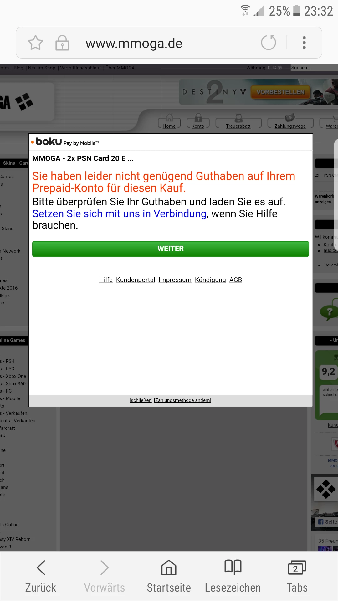 Ich benötige dringend Hilfe beim Zahlvorgang via Handy Rechnung und zwar wollte ich mir aus MMOGA eine Psn Karte kaufen ging allerdings nicht da auf der Seite steht das ich nicht genügend Guthaben habe obwohl ich ein vertragshandy habe könnte mir jemand helfen? Danke im voraus.