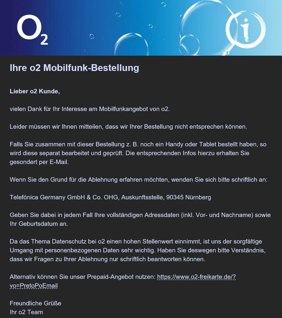 ich wollte heute zu O2 wechseln. Ca. zehn Minuten nach dem ich meinen Vertrag bestellt habe, bekam ich eine E- Mail, in der draufstand, dass “die Bestellung nicht entsprechen werden könne” (s. Foto).