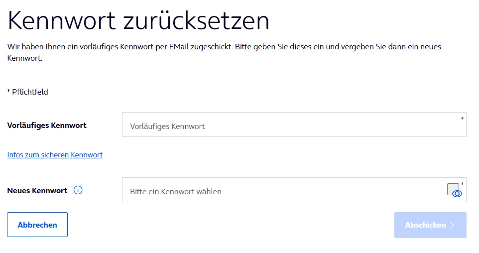 Klickt dafür auf Kennwort vergessen. Euch wird ein temporäres Kennwort per E-Mail zugeschickt, welches in der Mail Sicherheitscode genannt wird.