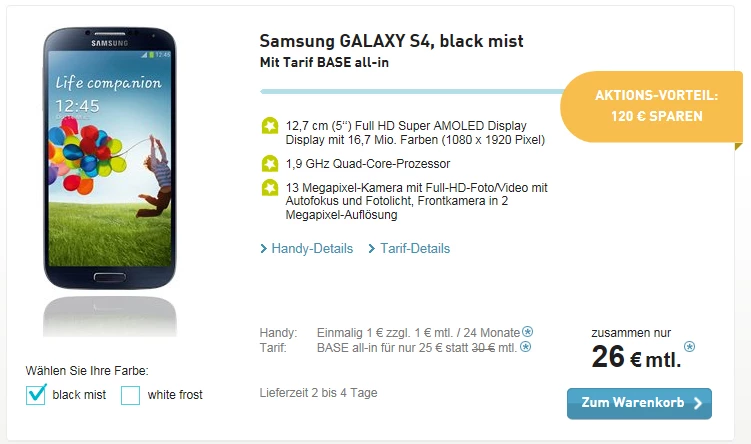 Jetzt nochmal von vorne. Mir ist es egal, was dort von irgendjemandem eingestellt wurde. Mir wurde damals für den Umstieg von eplus zu BASE das damalige BASE-Online-Mai-bis-Dezember(2014)-Aktionsangebot zugesichert. Preis für 24 Monate = 25,00 € zzgl. 1 € für ein Samsung Galaxy S4. In Summe also 26,00 €/Monat. Für 24!!! Monate. Nicht 21 und nicht 19.
